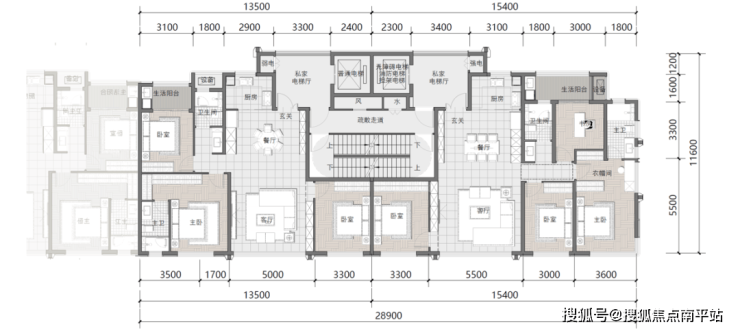项目涵盖建面约116-169㎡面积段户型,二梯两户,私梯入户。产品围绕“单点为主、超大面宽、超大实得、私家明梯”等几个亮点进行产品设计,通过4个设计亮点体现:私家电梯、转角景观,社交厨房、自由巨厅、X空间、南北通厅、超尺度全景阳台。