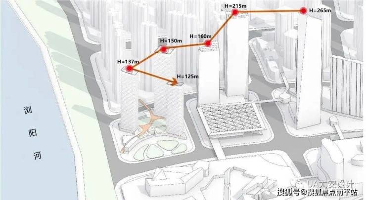 规划布局:三栋塔楼呈品字形排列,高度逐级抬升(125m、137m、150m),形成错落有致的天际线,最大化利用景观资源。