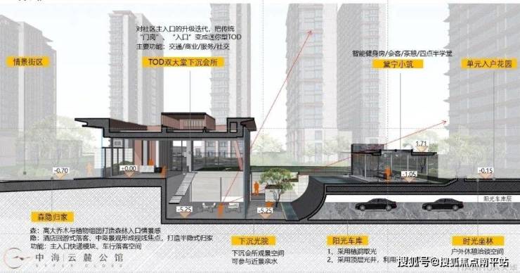 下沉庭院—建筑与景观融合设计,项目从社区入口大堂到归家单元门户,在建筑、景观、室内一体结合设计下,建立了高度融合的立体归家系统,让归家成为一次如度假般的缦系之旅。