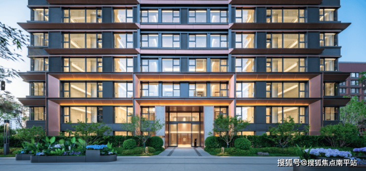 建筑色彩的选择上,提取传统建筑色彩,打造沉着内敛,经得起时间沉淀的立面肌理。仿铜铝板+浅灰色铝线条、仿铜色线条为立面增加一丝温度,营造温馨、浪漫的生活氛围。