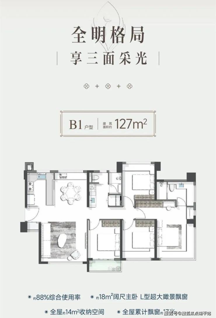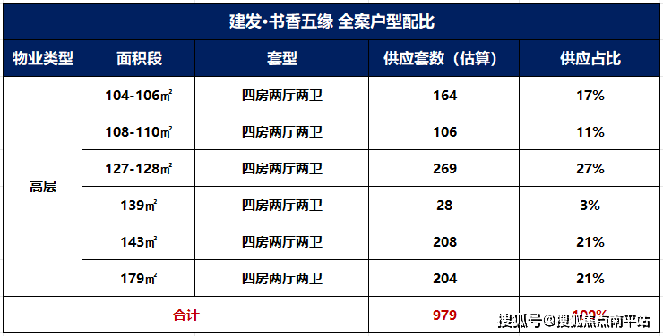 项目规划约979套高层住宅,产品涵盖104-179平全维面积段。主力户型为127-128平四房、其次143/179平四房。
