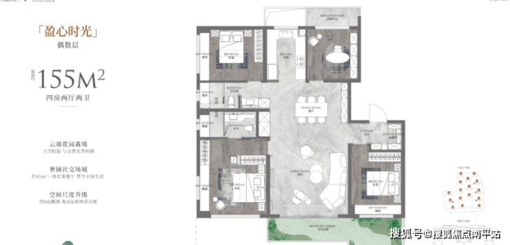 155㎡户型优化四叶草布局,四卧室独立分布,无过道浪费面积,搭配约5米宽厅+空中花园,采光与尺度兼具。