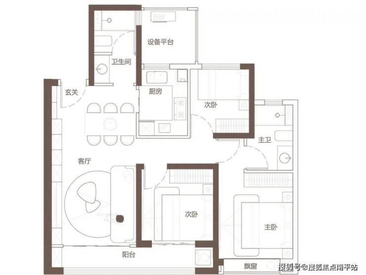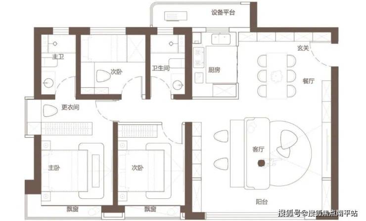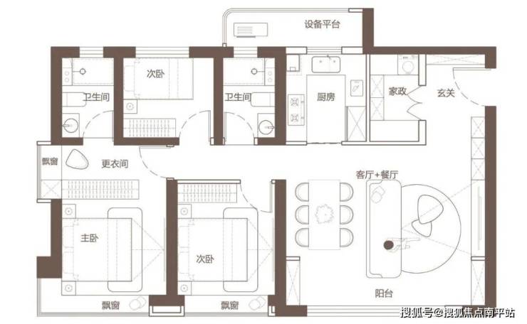主卧面宽达3.9米,采用三套间设计并配270°飘窗;
