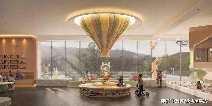 中央区域将打造圆形矮书架与热气球装饰,倚靠大面积落地窗布置休憩沙发,家长看护观景两不误。