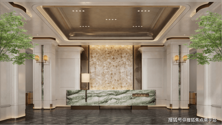 中央打造奢石水景,海棠花瓣造型雕塑以维多利亚绿奢石为衬,仿佛「浮光跃金,静影沉璧」的诗意再现。