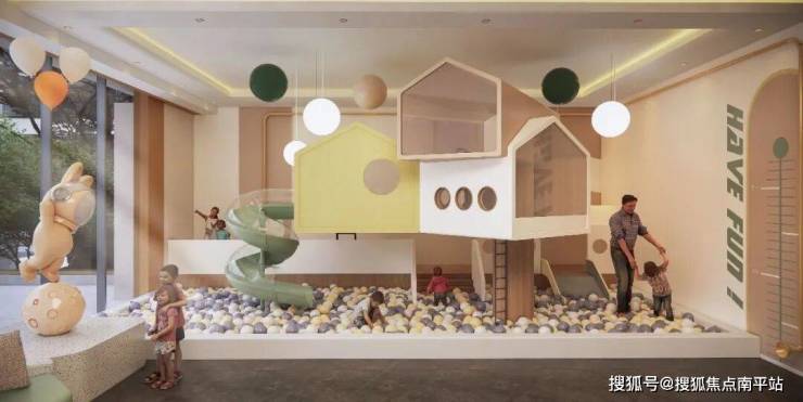 两边则分别规划为配备植物认知墙的 亲子手工坊,以及包含海洋球池、滑梯的 「飞屋城堡」,关照不同年龄段儿童的娱乐成长需求。