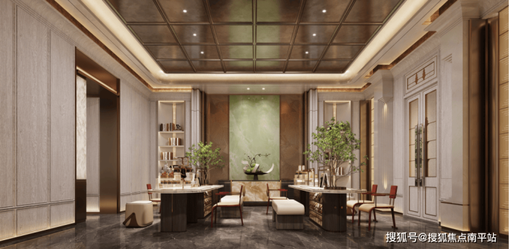 翡翠绿奢石、 珍珠母贝拼贴、金属格栅等材料的点缀,加深细节的精致。