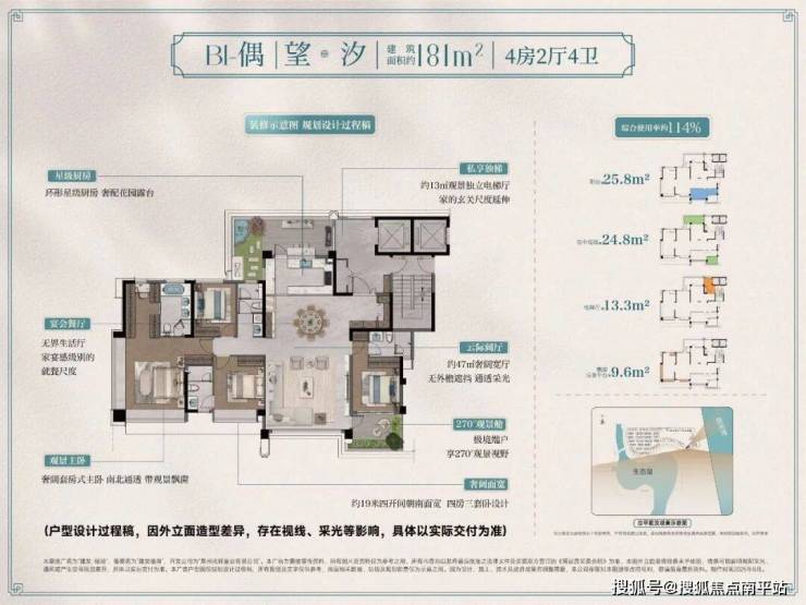 一梯一户,270°IMAX巨幕全景舱,三面采光,通透端户,拥揽湖海园三重风光, 整体空间做到了比肩160㎡的享受,主卧配置270°观海飘窗,约15米四开间朝南,南向双套卧,270°寰幕湖海园。