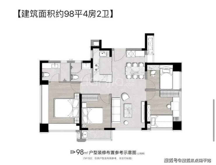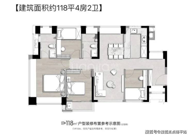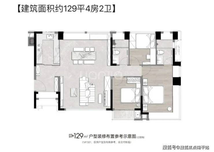 :双主卧套房设计(或长辈房套房),适合三代同堂居住,互不打扰。(约12.83平米)的大露台加上入户花园,实际使用面积远超建筑面积。