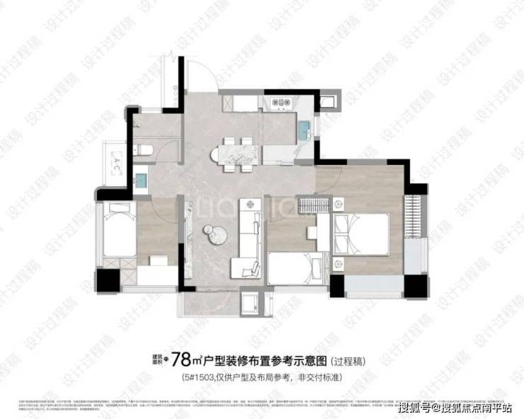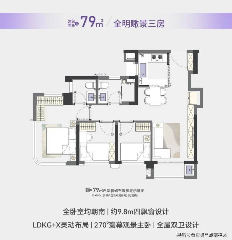 :79平做3房2卫是极大的卖点,且做到了全明、双卫,主卧还有270°飘窗。这种高赠送率的设计在市场上非常抢手,解决了预算有限但需要多房间家庭的痛点。