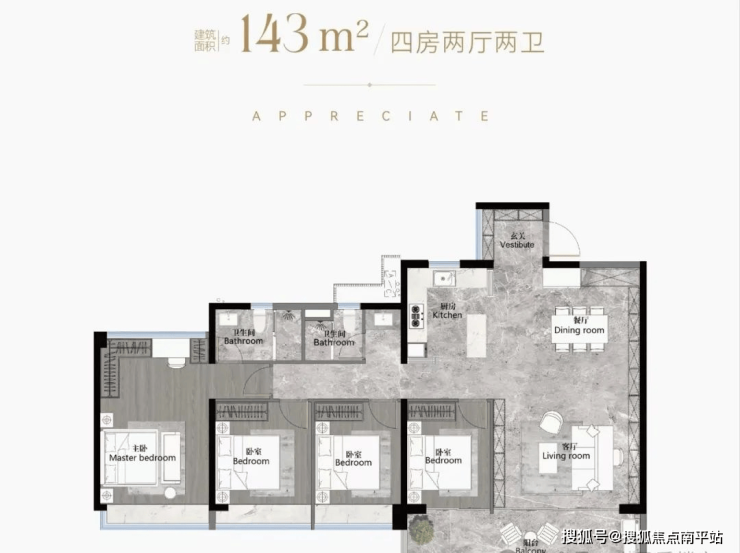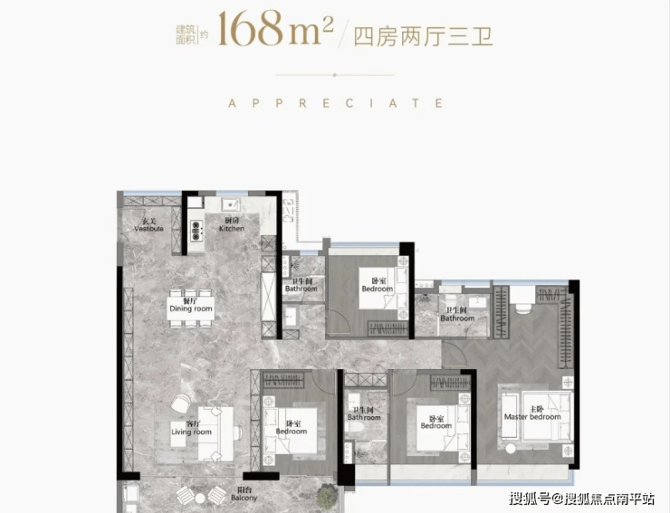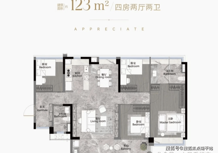 建面122平四房两卫,南北对流户型,LDKB一体化设计,约7米长景观阳台,主卧设置L型衣帽间,三个次卧差不多大小,转角玄关用作收纳,总价560-650万左右。