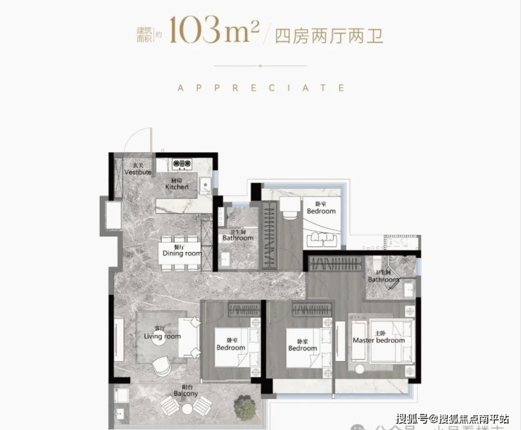 建面103平3+1户型,空间尺度非常大,当下标配的LDKB设计,玄关预留超长的S墙收纳,主卧和次卧都有整排的衣柜空间,其中一个次卧还有270度飘窗采光,总价450-510万左右。