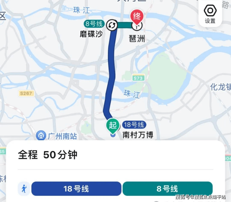 地铁去往琶洲:出小区步行至南村万博站,乘坐18号线到磨碟沙换乘8号线,再到琶洲,全程5个站,耗时50分钟左右。