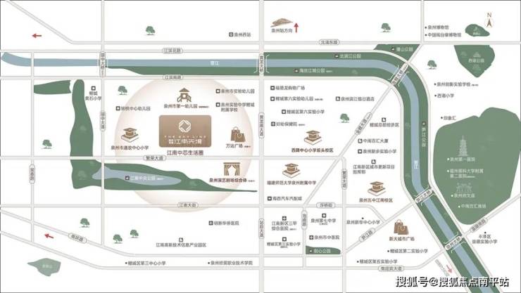 而「泉州发展·江南天境」,雄踞江南中央生活区核芯,方圆300m内涵盖泉州市第一幼儿园(珑璟湾园区)、通政小学(田中校区)、泉州实验中学(鲤城附属学校)顶级的全龄教育配套;小区出门就是鲤城万达广场(预计年底开业),一路之隔的泉州演艺剧场综合体预计26年开业;北侧600m(直线距离)的海丝江城公园预计26年竣工,多所三甲医疗近而不临。江南天境的生活日常,成为了别人的生活配套。