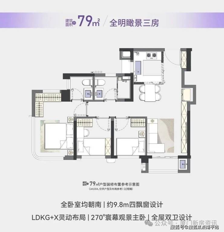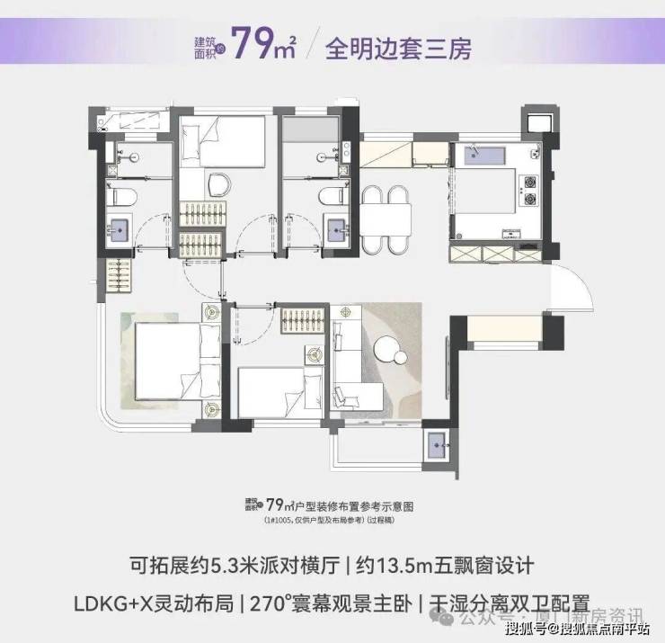 79 平:225-261 万,全明边套三房,南北通透,更做好了三房两卫的全功能配置,光飘窗就有5个,主卧室是270°寰幕观景,15楼以上还能瞰湖,使用率超90%,比肩市场100 平的空间感,刚需直接一步到位。