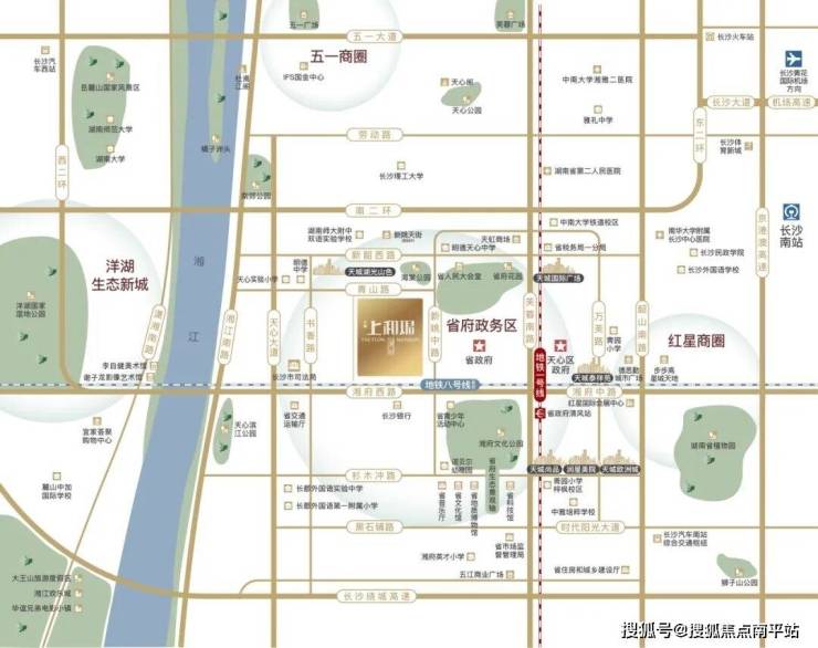 项目位于天心新姚路与湘府路交汇处(省府西侧),东门距离省府约 50 米,是全长沙距离省府较近的楼盘,地处省府核心板块,周边商业、文化等高阶资源密集。