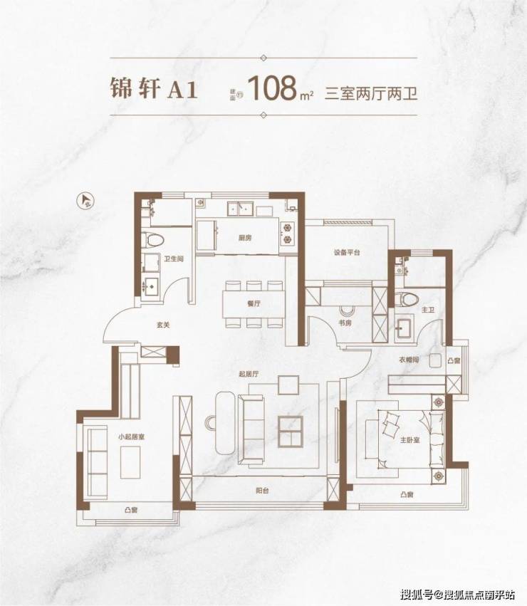 108㎡户型:独立入户玄关,满足收纳需求;约5.2m方正宽厅,待客、生活皆从容;落地宽景阳台,LDK动线,提升生活居享舒适度;奢阔主卧套房,配备独立卫生间/衣帽间,其中部分户型更设计了转角飘窗,尽享270°广角视野。