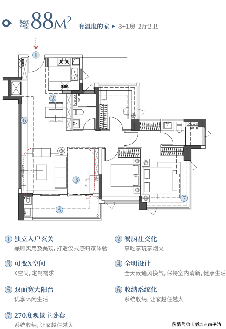 88户型3+1房2厅2卫设计,精心规划了4开间朝南,确保充足的日照与通风。厨房采用开放式LDK(客餐厨一体化)设计,U型的布局不仅美观,在实际生活中会更加实用。客厅与X空间相连,开间达到约5.3米,使得客厅区域显得尤为阔绰,结合双面宽阳台,营造出豪华客厅体验。未来家庭需求若变化,轻松改造即可升级为四房,完美适应家庭成长需求。