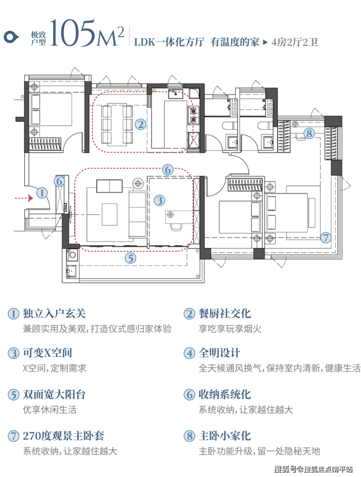 105户型4房2厅2卫设计,精心规划了4.5开间朝南,更加注重居住舒适度设计。开放的餐厅与客厅空间南北通透;餐厅中心化设计,结合开放式厨房与餐桌互动;净尺寸5.1米餐厨一体化,提供更多生活场景,可分可合可塑性强。