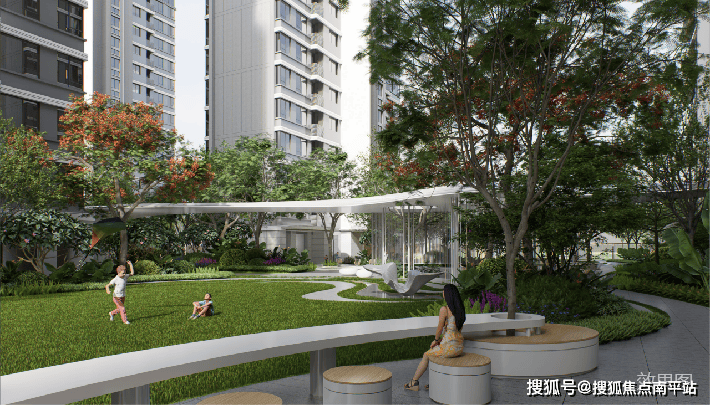 丰富生态休闲区:百米归家廊道、林下平台、花园卡座等,打造具有自然感、品质感的调性空间。