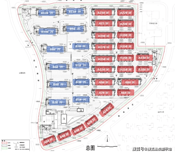 从总图上看,项目未来社区主入口以及物业配套用房在西华林街上物业配套用房包含泳池会所,风雨连廊等。