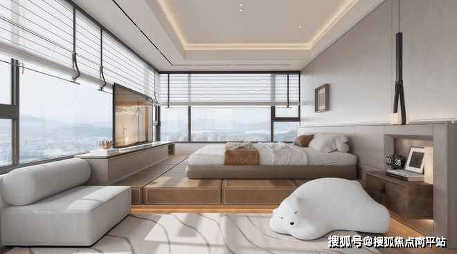 全景舱主卧设计:主卧均实现全景舱式设计,三面采光引入室外景观,可划分出休憩区、衣帽间、卫浴三大空间。