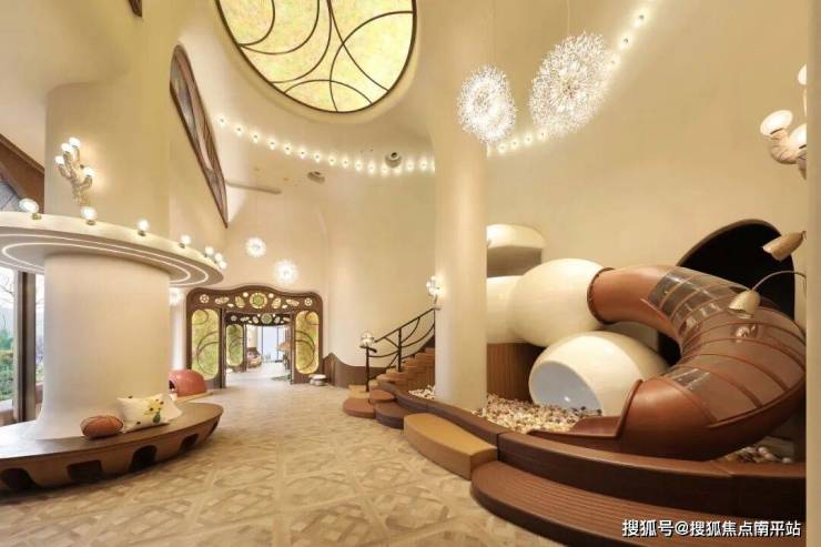 一方约7.6米高部分挑空童梦空间,奇幻的风格,带孩子们穿越到高迪的魔法世界。攀爬嬉闹、滑梯手工、亲子共读,每一个来过的人都相信,在这里,快乐是唯一的语言。