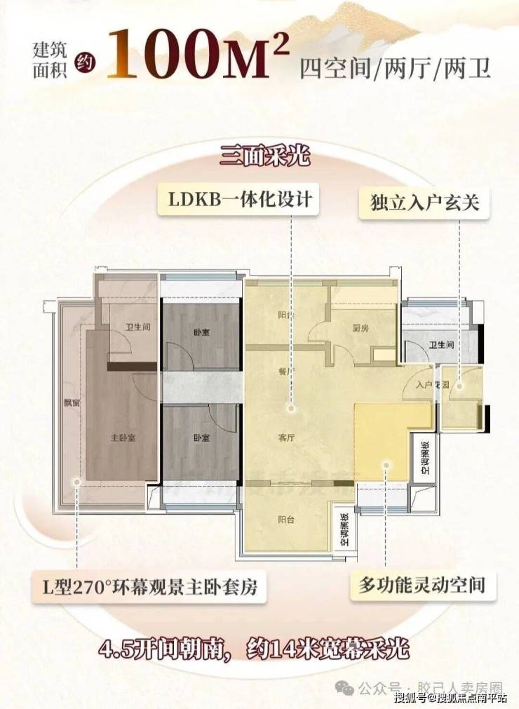 就拿最小的建面约100㎡户型为例,也做到了四个开间朝南,采光面超过14米。阳光从早晒到晚,家里每个角落都亮堂堂。