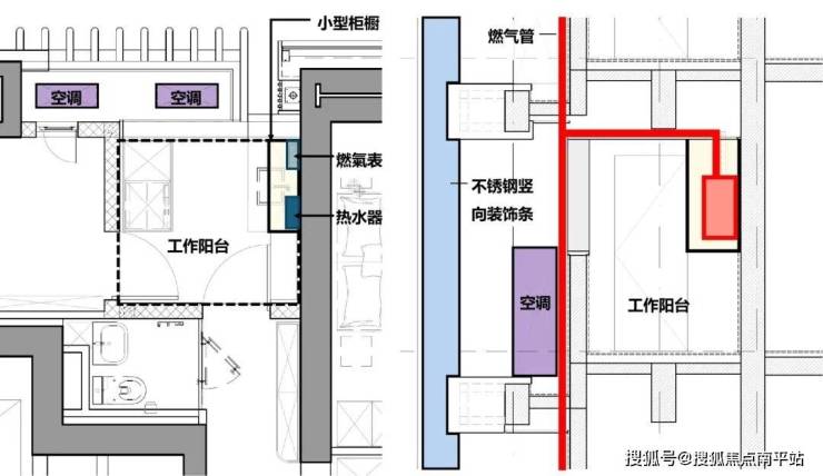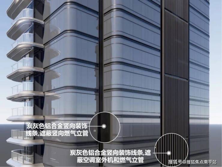 为保持立面完整,空调外机与燃气立管采用炭灰色铝合金线条遮蔽,空调遮挡格栅可从生活阳台直接检修。