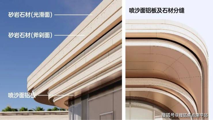 建筑基座以岩石为灵感,采用砂岩质感石材打造崖壁式造型,优雅曲线石材立面兼顾空调通风功能,实现实用与美学的平衡。