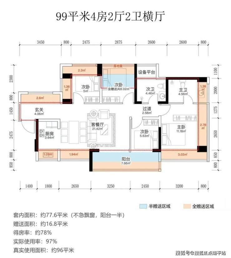 设计的是横厅南北通透格局,进门入户玄关,客餐厅5.9米开间,4个卧室分别做到了4米/3.1米/2.875米/2.45米的宽度,主卧+1个次卧270°飘窗,客厅连接次卧出5.7米长大阳台,U型厨房,得房率约97%(包含赠送),阳台主朝西南或东南向。