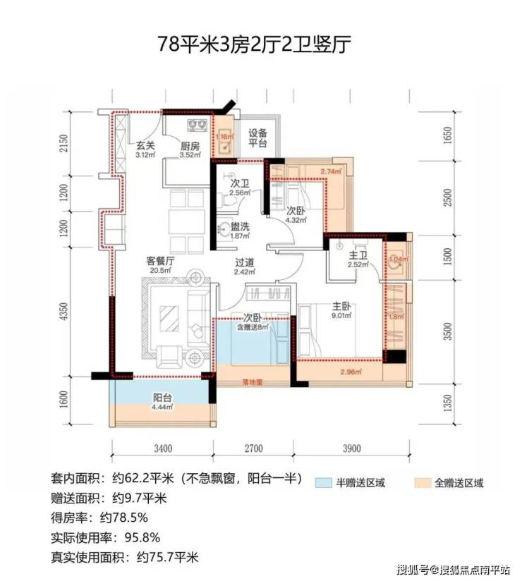 设计的是经典竖厅格局,进门入户玄关,客厅3.5米开间,动静分区,三开间朝南,3个卧室分别做到了3.95米/2.85米/2.8米的宽度,主卧+1个次卧270°飘窗,U型厨房,卫生间三段式分离,得房率约91%(包含赠送),西南或东南朝向。