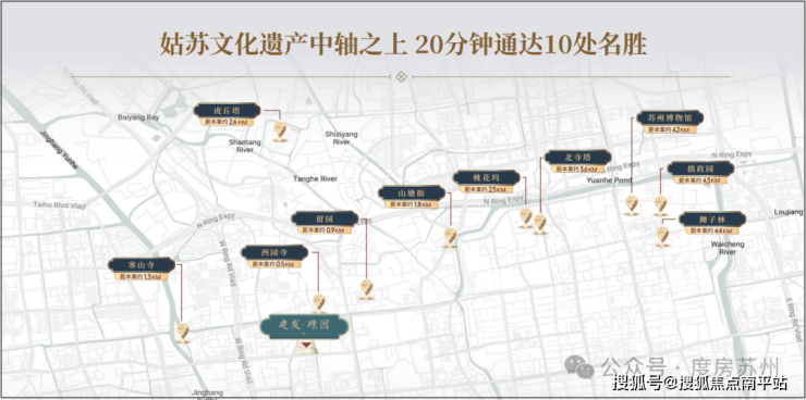 从建发璟园出发,仅约20分钟车程即可抵达苏州闻名世界的10处名胜古迹(如下图)!其中,西园寺、留园更是在1公里范围内,步行可达!
