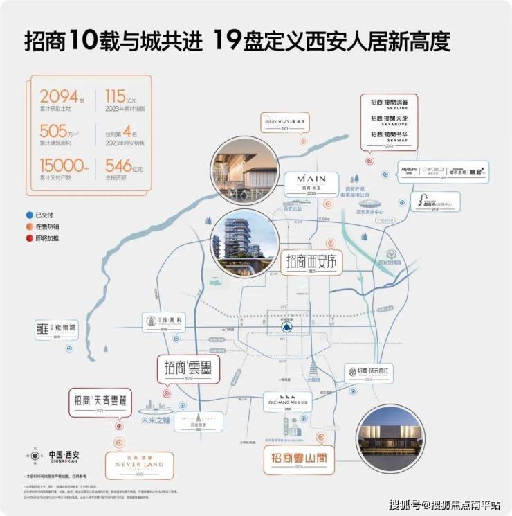 2014年,招商蛇口携依云曲江项目首次亮相西安。百年招商与千载西安的故事,便正式拉开序幕。此后9年,招商蛇口在西安相继开发招商雍景湾、招商城市主场、招商臻观府、招商局丝路中心、招商央玺、招商臻境、招商西安序、招商雲山間、招商雲蘭、西安伊敦诺富特酒店、招商揽阅等,以对待生命成长的方式升级城市。