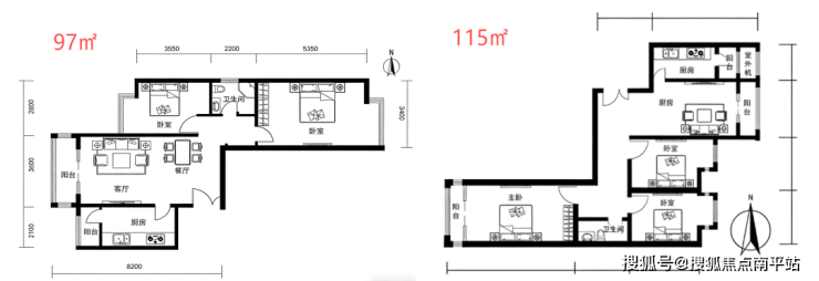 97平东西通透两居,两个卧室都带270° 转角窗,还是明卫设计;115平是东西通透三居,户型格局不算规整;