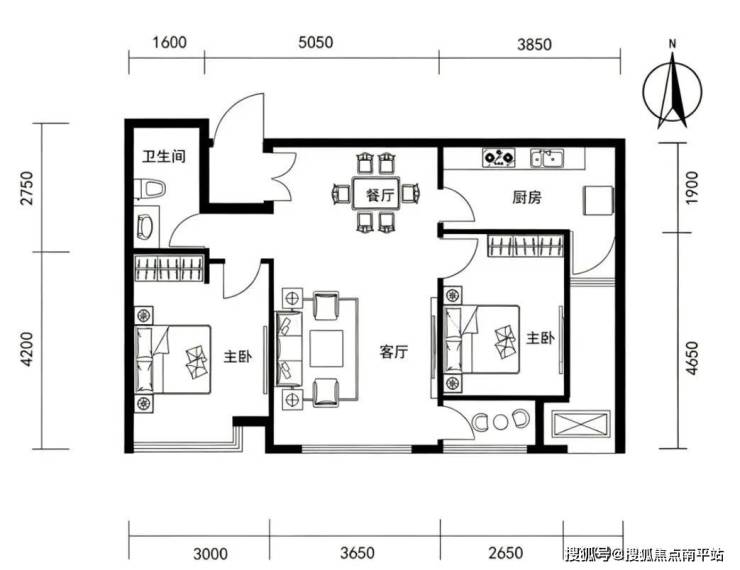 90平南向两居,是这批小户型里格局最能打的,南向 3.5 面宽,主次卧、客厅、厨房全朝南;