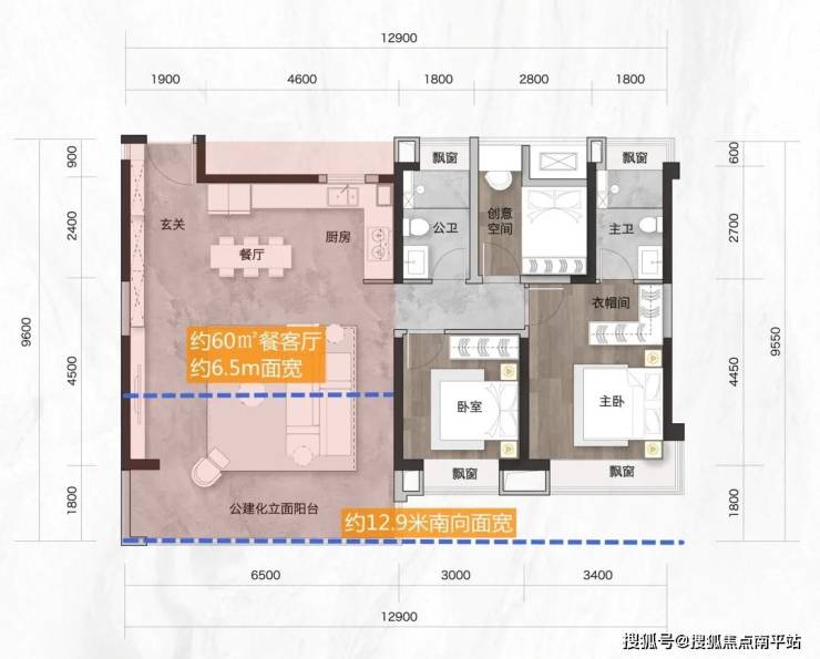 该户型三房两厅两卫设计, 南向面宽12.9米,客厅开间6.5米,空间尺度完全不输大平层!
