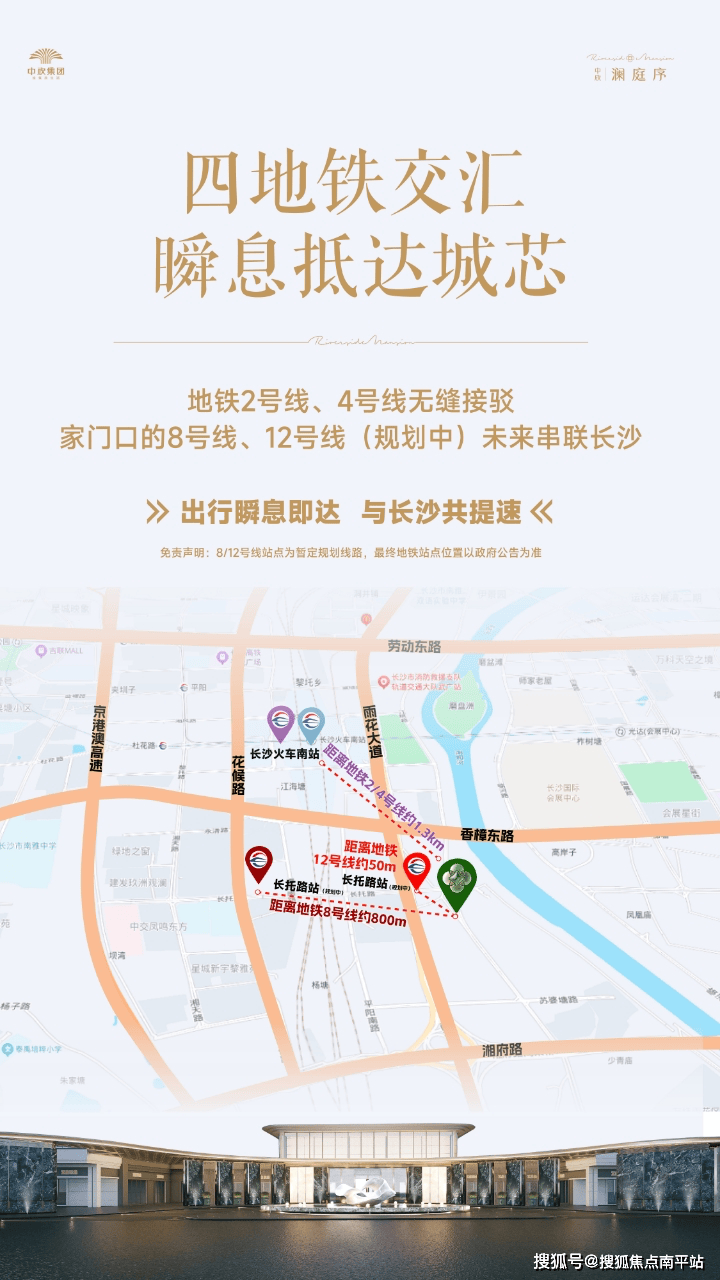 日常出行方面,项目与地铁2号线+4号线交汇的长沙南站直线距离约1.3公里,规划中的8号线、12号线未来预计都会在小区门口设立站点。