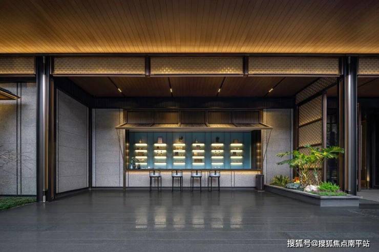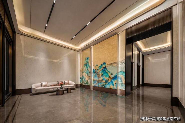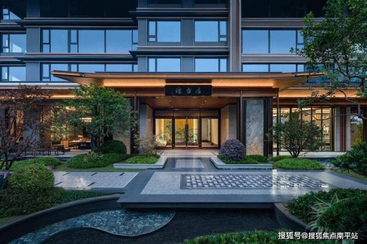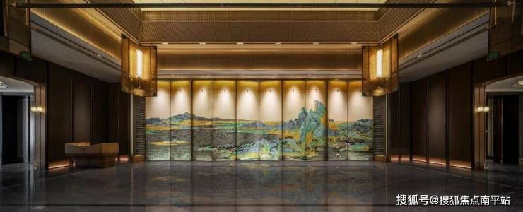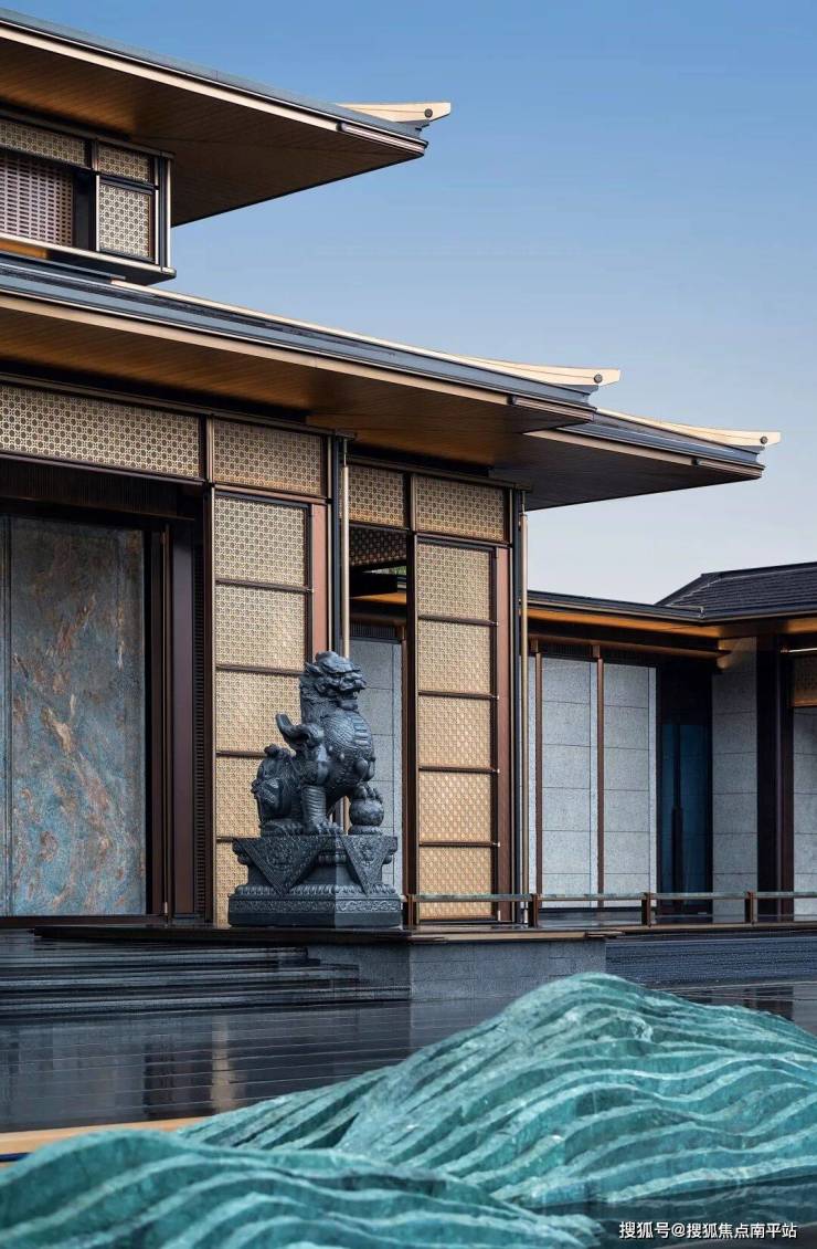 建发的项目往往从门看起, 经典的三重挑檐顶部造型、 镇宅瑞兽麒麟、对植罗汉松、 正中的巨幅《千里江山图》,由画入境。