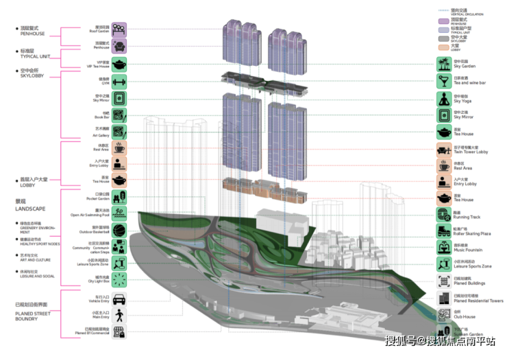 利天瓒通过“超级底盘”的设计思维,通过抬升、退让、融合的整体规划,在垂直维度上实现功能的精准叠加:地面层向城市退让,形成开放的活力街区;之上,则托举起极具私密性的社区空间。这让天瓒的底盘不再是冷硬的边界,而是一个充满“高级烟火气”的温暖场域,让社区优雅地嵌入城市肌理。