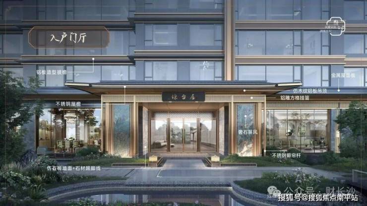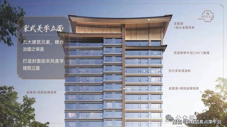 臻材实料:东方美学公建化立面,宋韵飞檐造型,高级配色金属材质线条+隔音隔热性能俱佳的LOW-E玻璃+深灰色真石漆基底,打造历久弥新的美学立面。