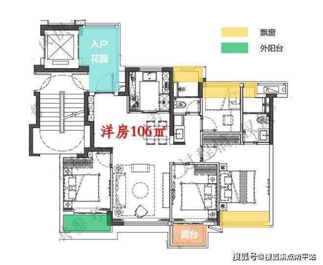 洋房106㎡户型,同样具备第四代住宅的空中花园元素,全屋赠送面积约20㎡,实现接近负公摊的居住效果,实得空间超过岛内主流的140㎡户型。