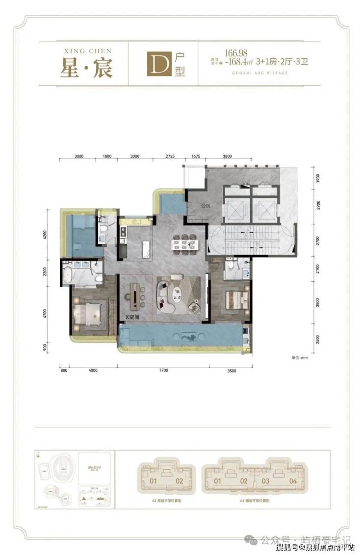 D户型: 建面约166.98-168.4㎡ 3+1房2厅3卫