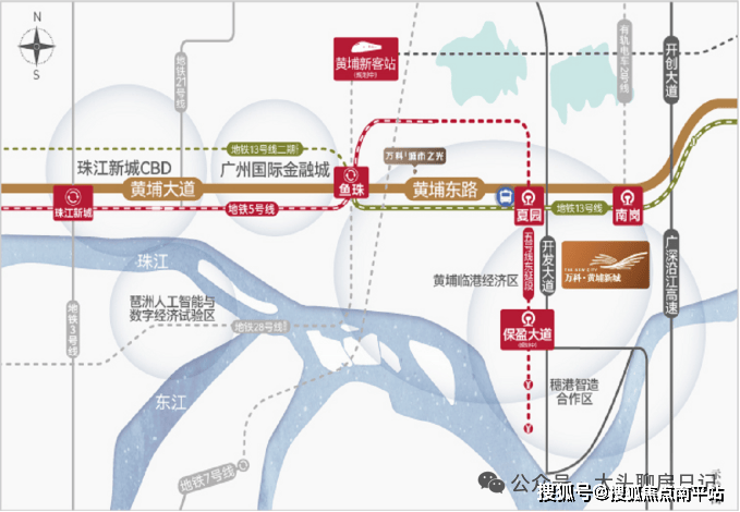项目临近5号线、13号线两条地铁线,覆盖夏园站(距离约740米)、保盈大道站(距离约770米)和南岗站3大站点,双地铁无需换乘均可直达珠江新城。门口就是黄埔东路,连接黄埔大道,组成贯穿广州东西的交通动脉,串联珠江新城 CBD、金融城和临港经济区 CBD,不走高速可达到珠江新城。