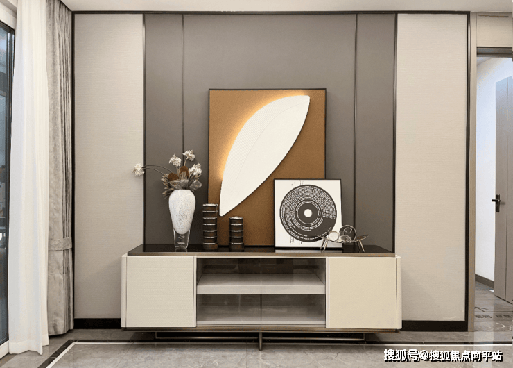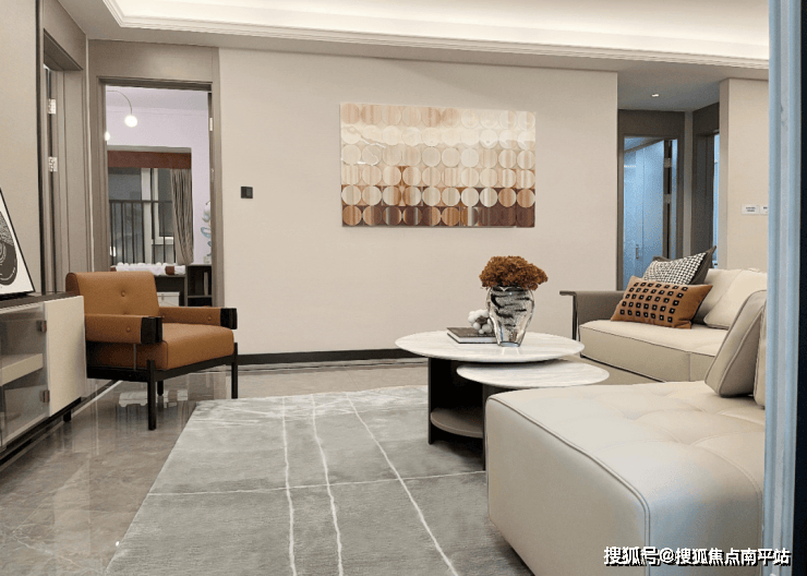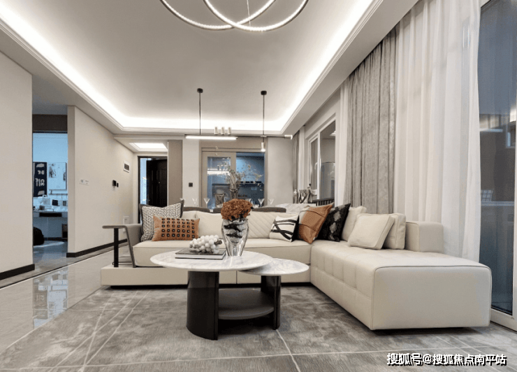 客厅采用暖灰色作为视觉主基调,辅以琥珀色丰富整个空间的感官层次。转角沙发造型简约、面料舒适,搭配极具艺术感的单人沙发,金属的质地更凸显主灯以及茶几的品质感和时尚感。