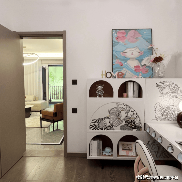 女孩房以泡泡玛特DIMOO水族馆为主题,打造解放儿童天性的独特个性生活空间。马卡龙粉色与蓝色对撞出活泼可爱的调性,主题雕塑挂画,摆件增加记忆亮点。台面上摆放有各种水精灵,独一无二的小飞鱼、圆滚滚的企鹅、头部云朵采用特殊温感设计的北极熊、古老航海家海龟、被誉为自然界顶级伪装高手的章鱼.....小小台面,仿佛收纳了一个童话水世界。