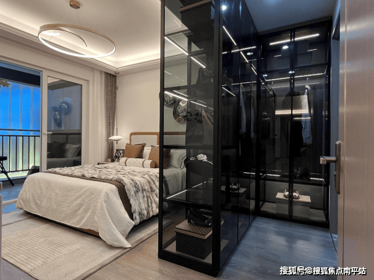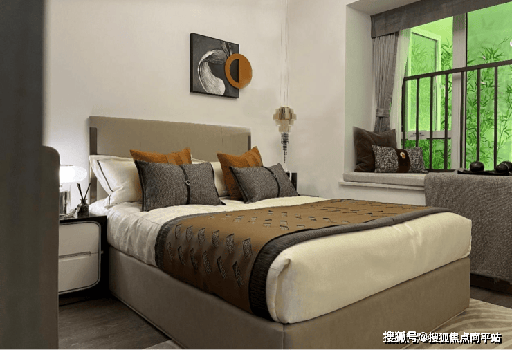 次卧以黑白灰搭配琥珀色,体现沉稳大气的休憩氛围。作为老人房,特别设置展示父母垂钓爱好的渔具摆件,闲暇时还可端坐于飘窗翻看各类钓鱼书籍,颐养天年好不惬意。