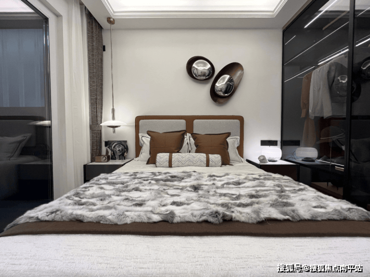 主卧以音乐为主题,选用马鞍皮床靠背,搭配皮革床头柜增加栖居品质感,墙面悬挂圆形壁饰,彰显主人的艺术涵养。