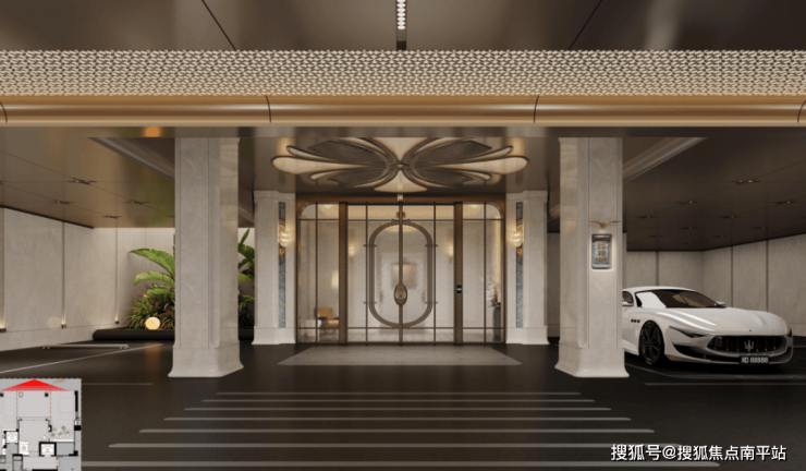 社区入口设计融合海洋元素的流体美学与几何美学,采用八根花柱造型;柱跨间为南洋风格艺术拼花彩玻,搭配奢石装饰门套、VI纹饰把手等细节,形成“八柱六门”入口空间;入口大门尺寸为12米高、90米宽。