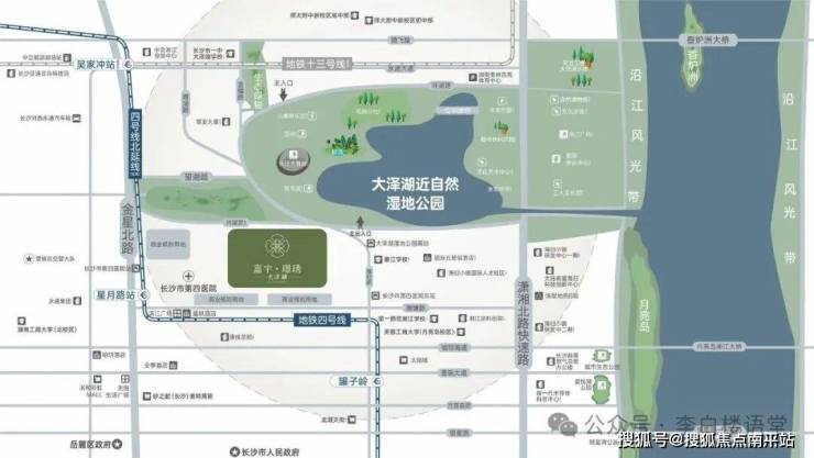 来,以湖、江为参照,找准楼盘位置。嘉宇·璟琇大泽湖向北一个地块,就到大泽湖;向东两个地块就到湘江边,到地铁、医院、学校都不远,位置绝佳。